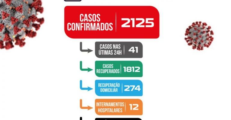 O número de casos suspeitos subiu para 108 e o de casos descartados subiu para 7.357. Quanto à evolução dos casos confirmados, o município tem 1.812 pacientes recuperados, 274 em tratamento domiciliar, 12 em leitos de internamento e 27 óbitos.