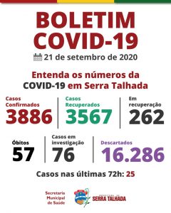 A Secretaria de Saúde de Serra Talhada informa que foram registrados 25 novos casos positivos de Covid-19 nas últimas 72 horas, totalizando 3.886 casos confirmados. São 10 pacientes do sexo masculino e 15 do sexo feminino, com idades entre 0 e 70 anos.