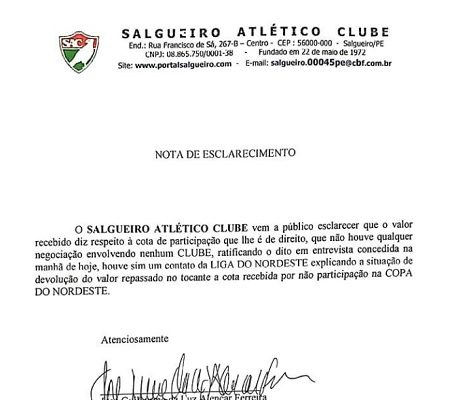 “O Salgueiro Atlético Clube vem a público esclarecer que o valor recebido diz respeito à cota de participação que lhe é de direito, que não houve qualquer negociação envolvendo nenhum clube, ratificando o direito em entrevista concedida na manhã de hoje (quinta-feira). Houve, sim, um contato da Liga do Nordeste explicando a situação de devolução do valor repassado no tocante a cota recebida por não participação da Copa do Nordeste”, escreveu o clube, em nota oficial, assinada pelo presidente José Guilherme.