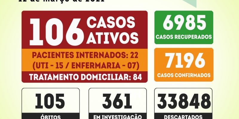 O município tem 361 casos em investigação, 33.848 casos descartados, 7.196 casos confirmados, 84 pacientes em isolamento domiciliar, 22 pacientes em internamento hospitalar (sendo 15 na UTI e 07 nos Leitos de Retaguarda), 106 casos ativos e 105 óbitos.
