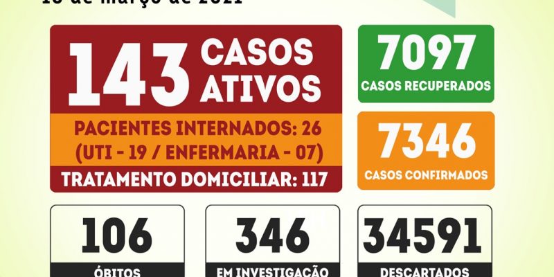 O município tem 346 casos em investigação, 34.591 casos descartados, 7.346 casos confirmados, 117 pacientes em isolamento domiciliar, 26 pacientes em internamento hospitalar, 143 casos ativos e 106 óbitos.