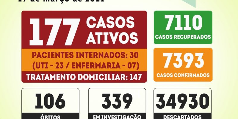 O município tem 339 casos em investigação, 34.930 casos descartados, 7.393 casos confirmados, 147 pacientes em isolamento domiciliar, 30 pacientes em internamento hospitalar, 177 casos ativos e 106 óbitos.