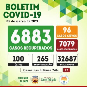 O município tem 265 casos em investigação, 32.687 casos descartados, 7.079 casos confirmados, 72 pacientes em isolamento domiciliar, 24 pacientes em internamento hospitalar (22 em leitos de UTI e 02 em enfermaria), 96 casos ativos e 100 óbitos.