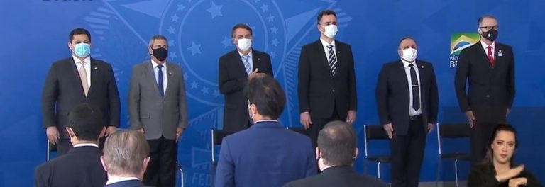 Em uma cerimônia na qual ele e as demais autoridades usavam máscara, o presidente Jair Bolsonaro sancionou nesta quarta-feira (10) a lei que facilita a compra de vacinas contra a Covid-19. Geralmente, Bolsonaro não usa máscara — nem os ministros e assessores, nas aparições públicas ao lado do presidente.
