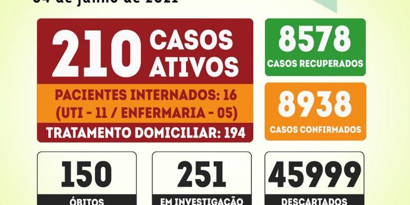 pacientes em internamento hospitalar, 210 casos ativos e 150 óbitos.