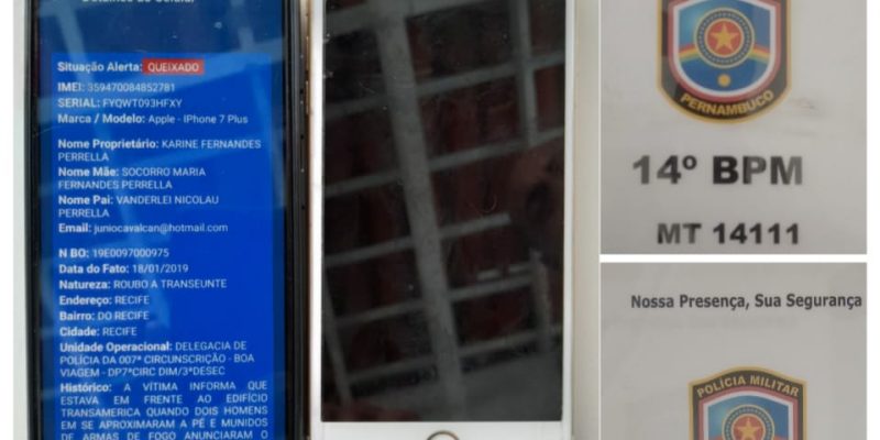 Policiais Militares do 14°BPM durante patrulhamento realizaram abordagem no envolvido 01, onde nada de ilícito foi encontrado, porém ao fazer a consulta do celular no aplicativo polícia ágil foi constatado que o celular, Iphone 7 Plus, teria sido roubado conforme registro de Boletim de Ocorrência, onde ainda informou que comprou o aparelho ao seu amigo, envolvido 02, por um valor equivalente à 1.800,00 reais. Diante dos fatos, conduzimos o envolvido até a DPC local para serem tomada as devidas providências cabíveis.