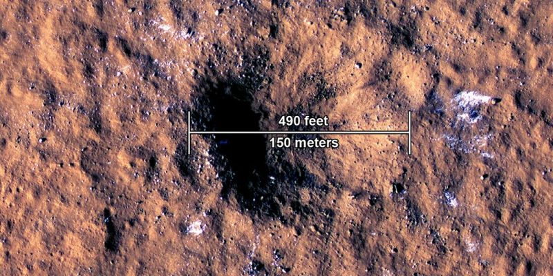 A imagem mostra blocos de gelo que foram projetados na superfície e uma cratera de cerca de 150 metros de diâmetro e 20 metros de profundidade, a maior já observada desde o início das operações da MRO, há 16 anos.