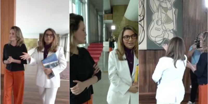 Janja deu entrevista à repórter Natuza Nery, da “GloboNews”, carregando um livro de fotografias do Palácio da Alvorada