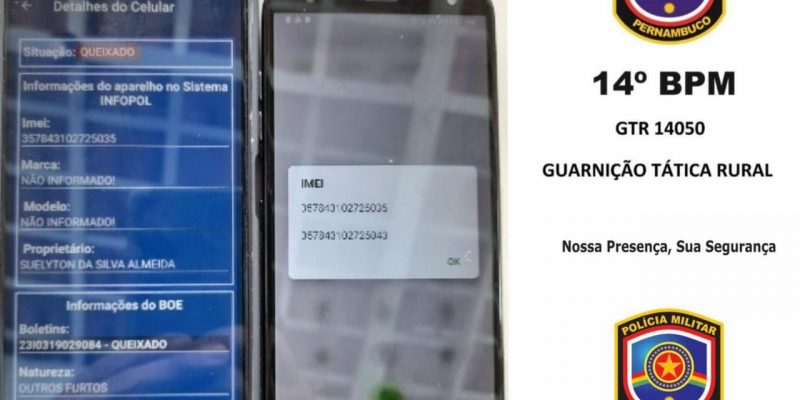 Na manhã desta segunda-feira (13), a Polícia Militar realizou abordagens no pátio da feira livre, mais conhecida como ‘feira do rolo’, no Centro de Serra Talhada, consultaram um aparelho celular, cujo IMEI é 357843102725035, no aplicativo polícia ágil e constataram que o aparelho celular de marca LG, modelo K12, havia sido queixado como furto.