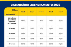 As datas variam de acordo com o final da placa do veículo. Finais 1 e 2 vencem em 5 de fevereiro; 3 e 4, no dia 10; 5 e 6, no dia 19; 7 e 8, no dia 20; e 9 e 0, no dia 25. Quem optar pelo pagamento em cota única até o vencimento de fevereiro terá desconto de 7%.