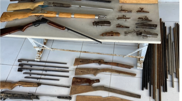 Ao longo da revista também foi encontrado chapas e peças de aço destinadas à fabricação de armas de fogo, além de três espingardas artesanais e uma espingarda industrial calibre 36. Esta última estava qual próximo à oficina e foi entregue pelo responsável da oficina.