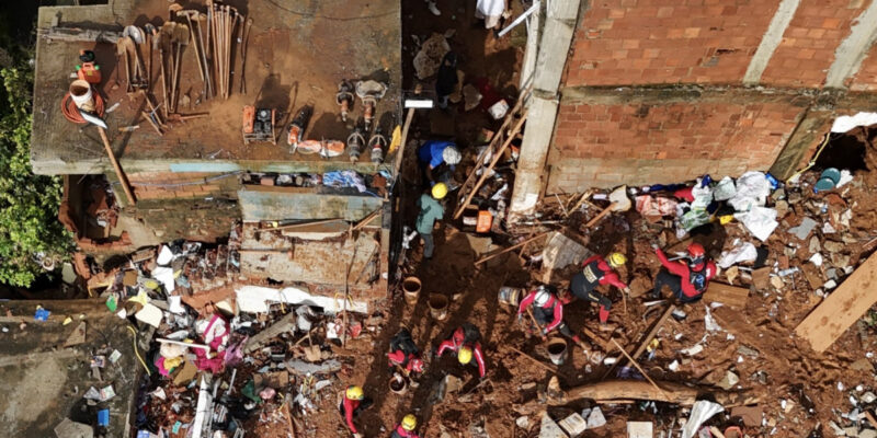 As chuvas causaram alagamentos e deslizamentos de terras e os bombeiros trabalham para buscar sobreviventes e para retirar os corpos em meio aos escombros.