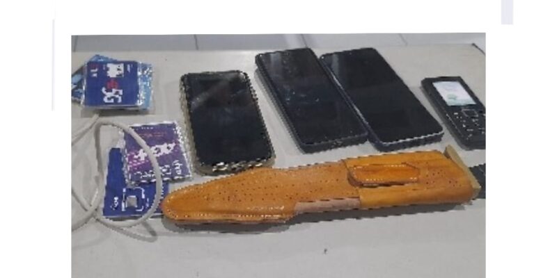 Com ele foram encontrados um facão e um boné pertencentes ao estabelecimento, além de outros objetos como carregador de celular, trena métrica, sete chips telefônicos e quatro aparelhos celulares. Ele foi conduzido à delegacia de policia local.