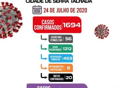 informa que foram registrados 56 casos positivos de Covid-19 nesta sexta-feira (24/07), totalizando 1.694 casos. O número de casos suspeitos é de 93 ...